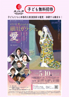 熊本肥後藩主となる細川家2代当主・細川忠興の妻です。関ヶ原の戦い前夜、敵方の人質となることを拒み、自らの命を絶ち信念を護りぬいた生き方は当時も今も語り継がれています。その壮絶な人生を歌で紡ぐ公演に子どもたちを無料で招待します。物語と音楽が織りなすガラシャの愛と祈りの世界は、特別な体験として心に響くことでしょう。