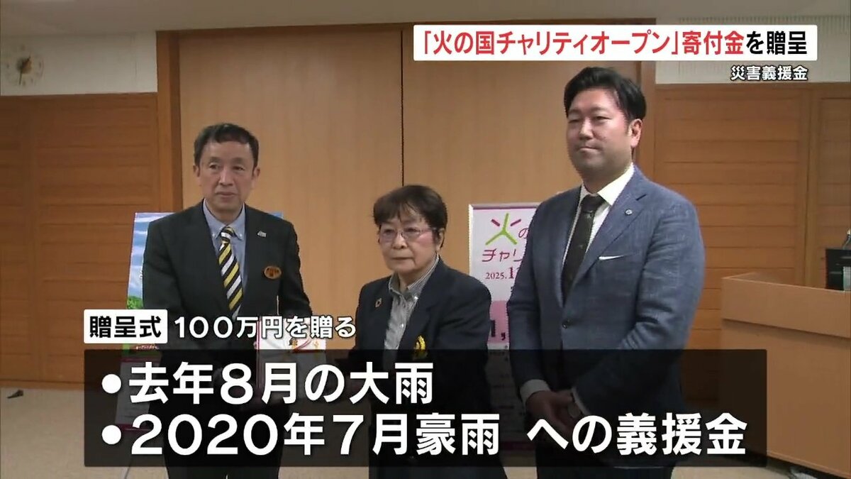大雨被害の復興に プロ・アマ集う「火の国チャリティオープン」実行委が寄付金100万円を熊本県に贈呈プロとアマチュアのゴルファーによるチャリティーゴルフ大会で集まった寄付金が熊本県に贈られ...