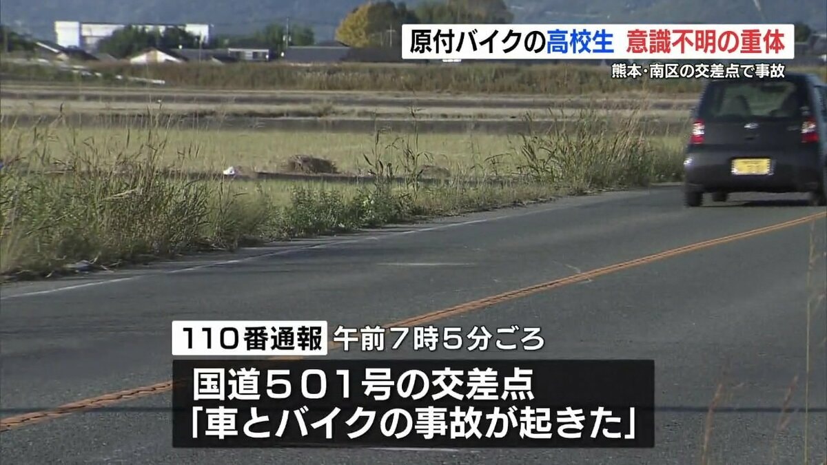 原付きバイクの高校生が意識不明の重体 高校教諭運転の軽トラックと衝突 熊本・南区けさ(12月6日朝)、熊本市南区の交差点で、原付きバイクと軽トラックが衝突する事故があり...